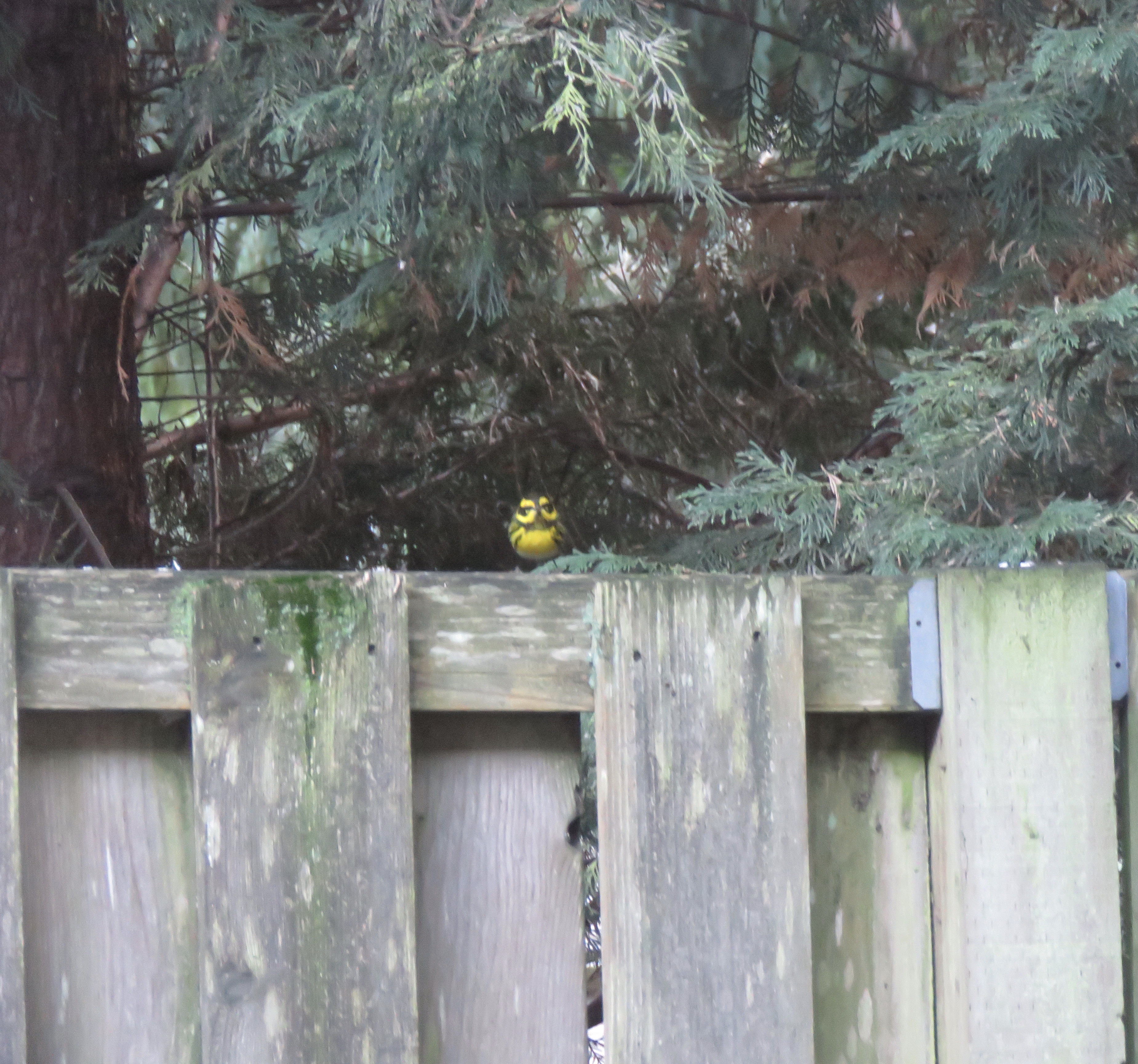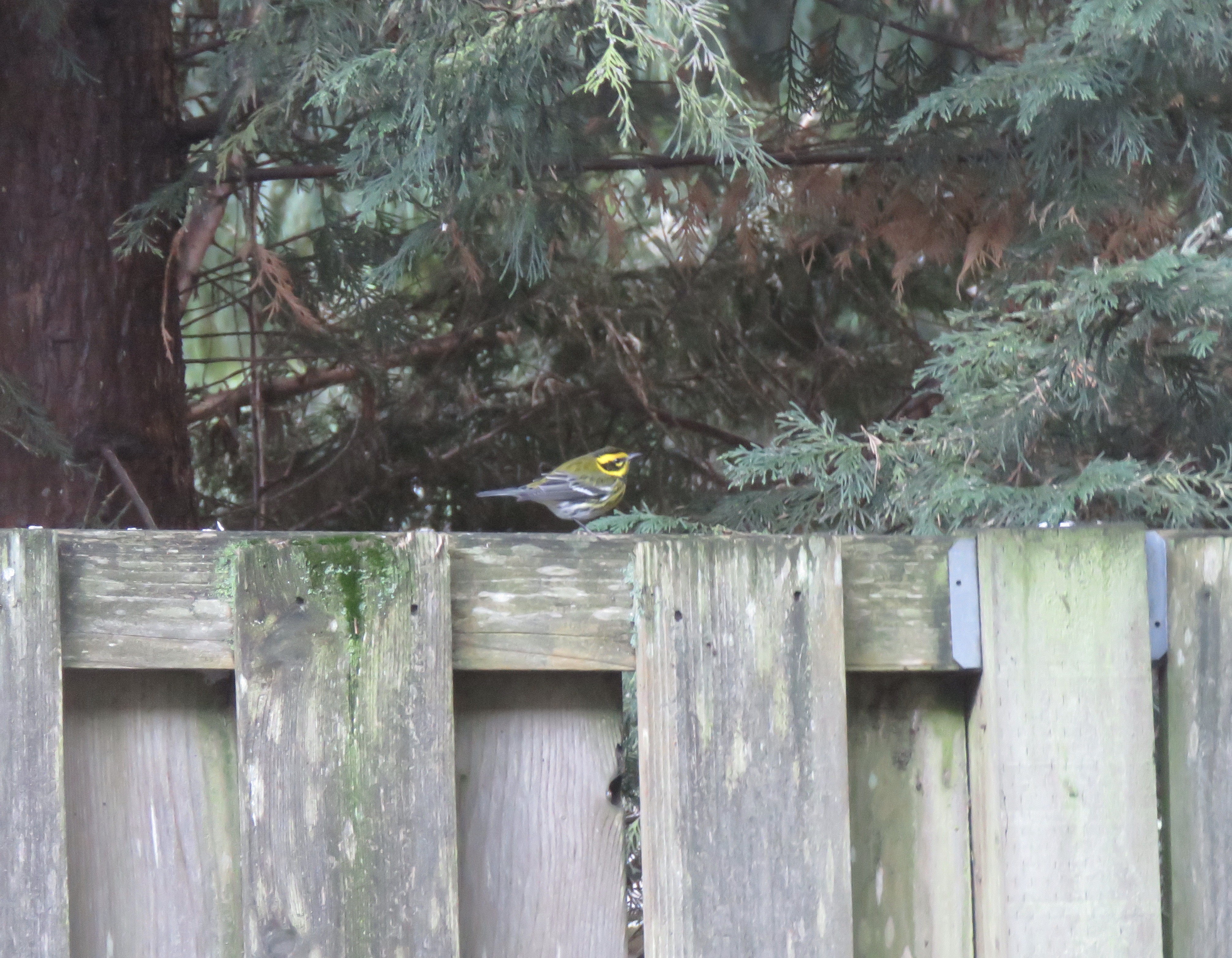 I have started keeping my big camera (just a Canon point-and-shoot) on my kitchen table, so if anybody shows up in the back yard, I can capture him. Well, yesterday I got a good one! My favorite little Townsend’s Warbler showed up, and I got in a couple of great shots of him on the fence.