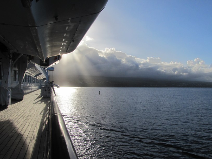 On that cruise to Hawaii, we did see some pretty dramatic skies and sunsets. We went to one of the ship’s restaurants that was at the stern of the ship. It looked like there was a lid on the world, and the sun was just peeking through the gap between the clouds and the water, before the clouds took over.