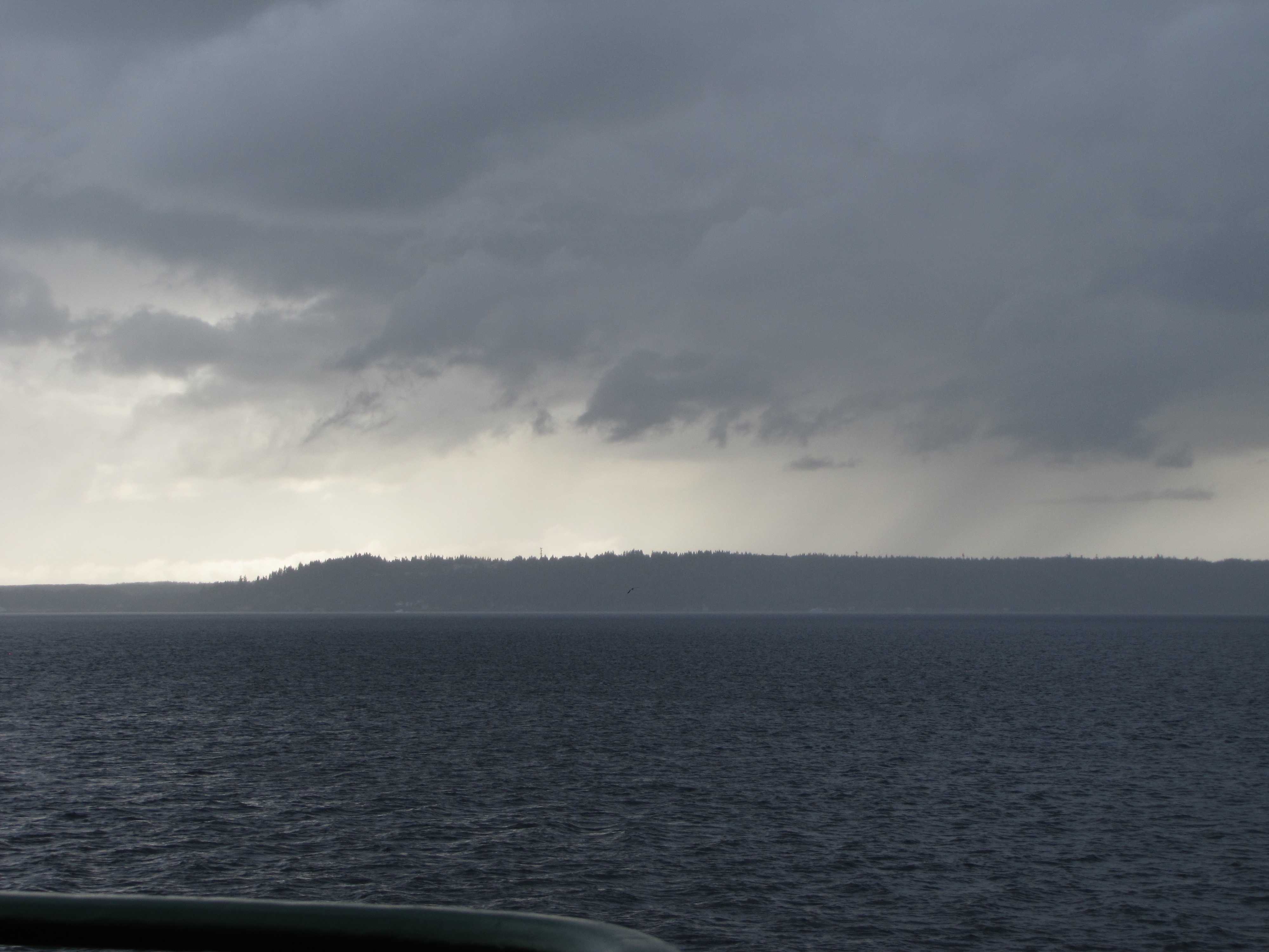 Taken from the deck of a Washington State Ferry going west on Puget Sound, you can see that the people on the Kitsap Peninsula are getting rained-on. By the time we arrived, the sun was already coming out.