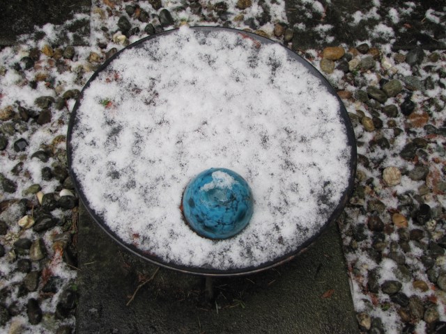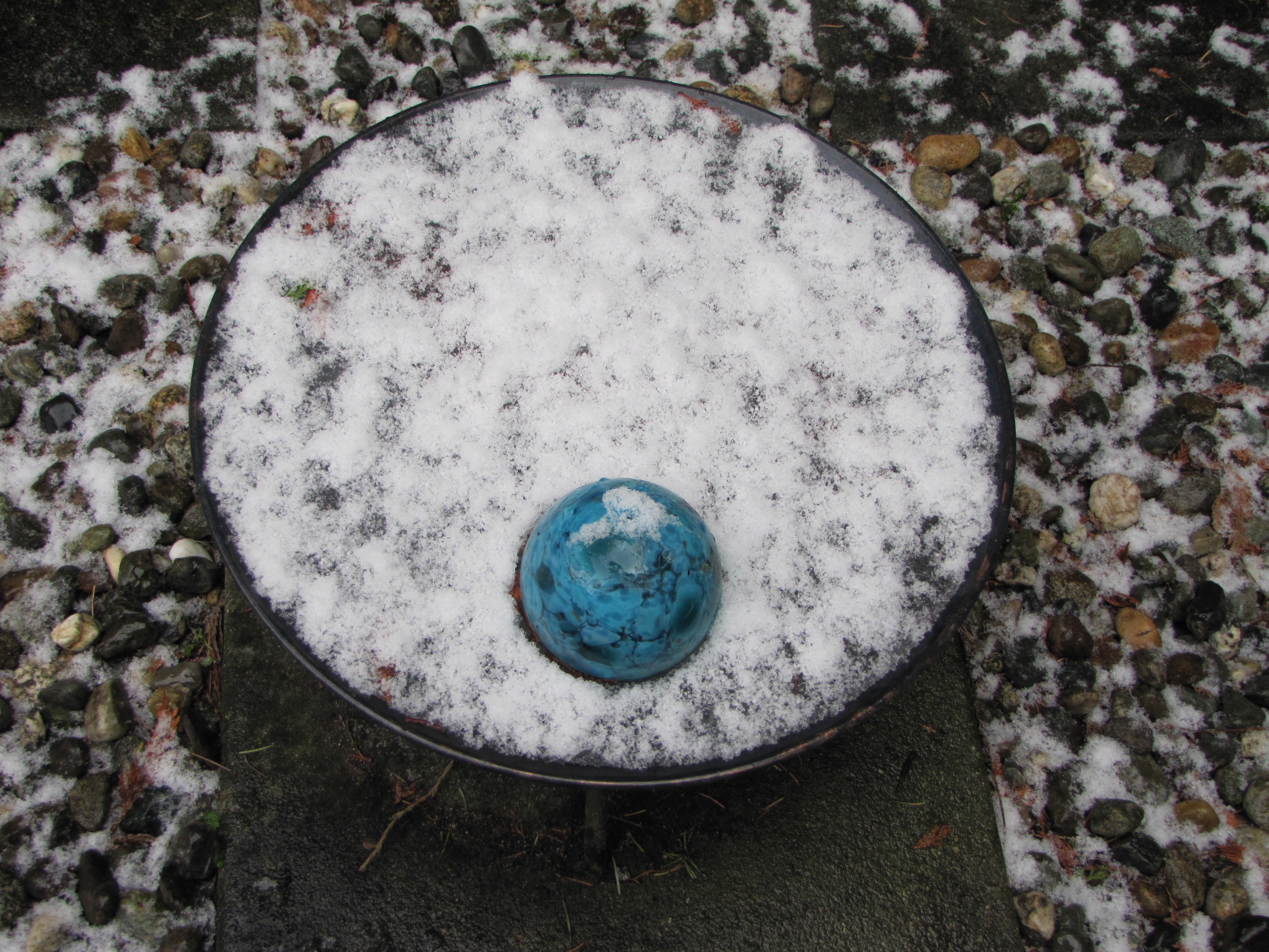 Here is a circle within a circle. The birdbath in my backyard, frozen and snowy.