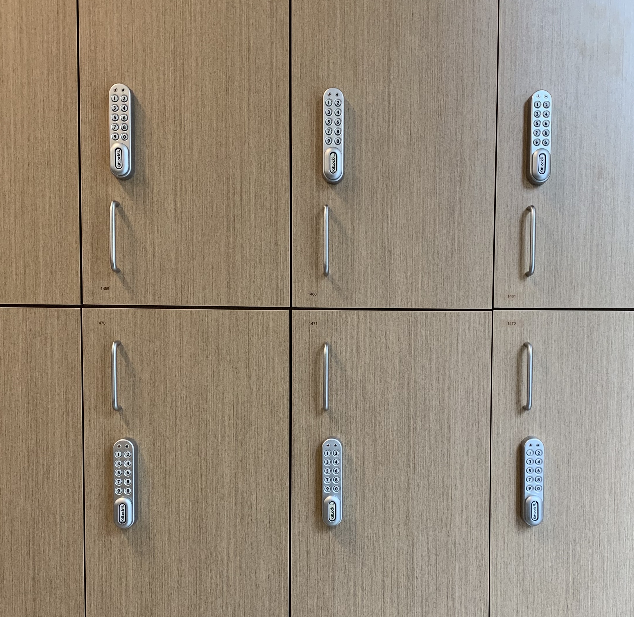 After I got the shot, I was told to find a chair and sit for 15 minutes, in case of any adverse reactions. My chair just happened to be near a bank of employee lockers. Now, these are pretty fancy lockers, compared to what I’m used to in athletic clubs and schools. Each one has its own combination lock on the front, and I was taken with all the geometry. Circles within ovals, ovals within ovals, with some straight lines.