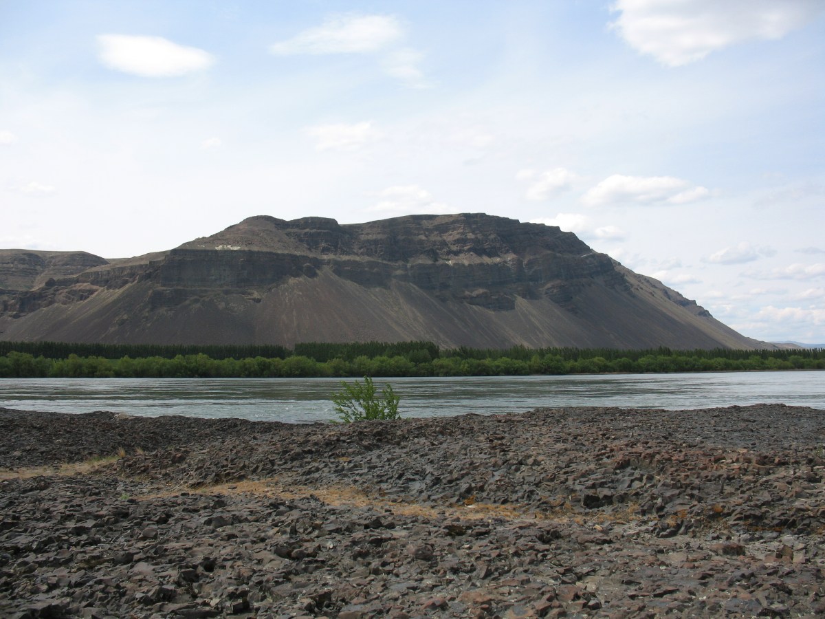 Above is the “before” picture, the hills above the Columbia Gorge near Wenatchee, Washington. Below is the “after” picture, when the basalt has crumbled, and now makes up the beach on the Columbia river. I’m pretty sure this rock dates from long before the highway and the city were built!