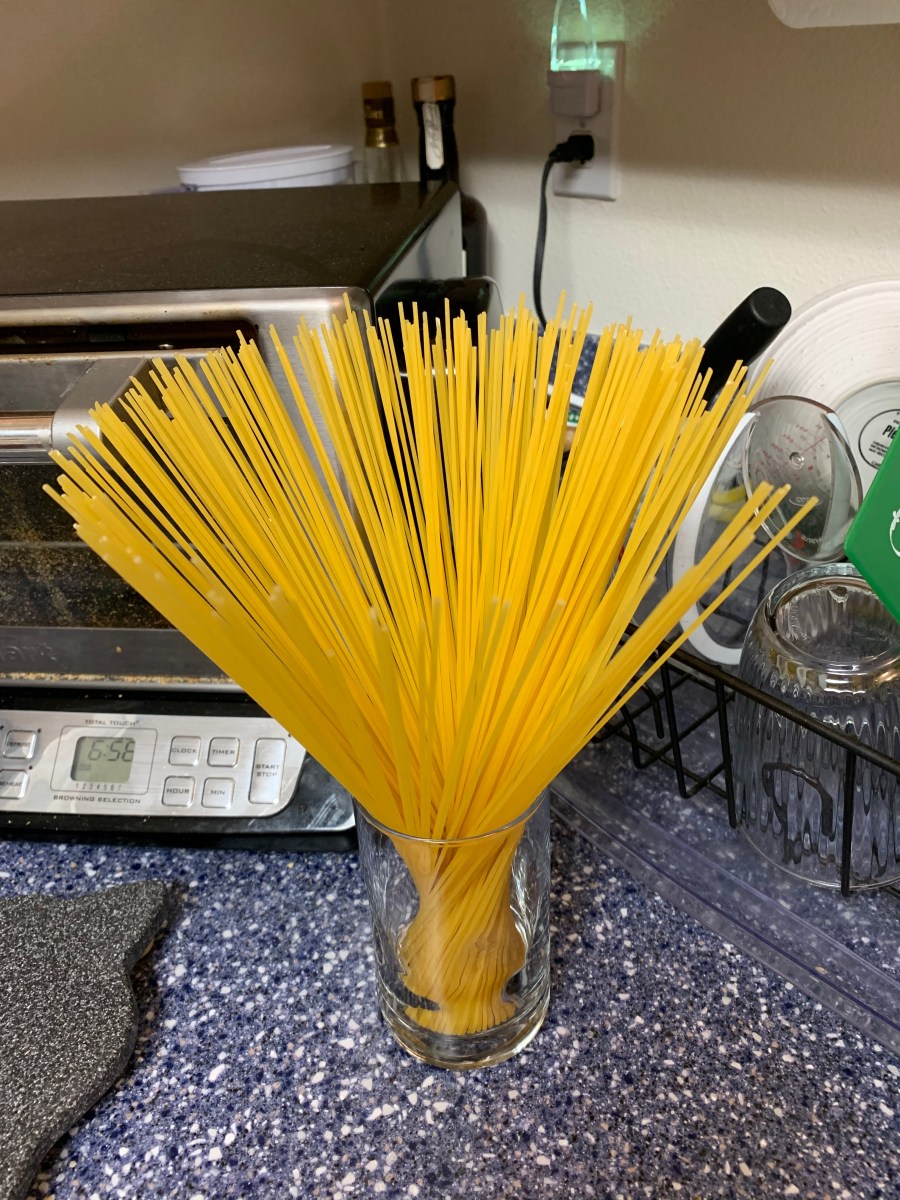 When we make spaghetti at our house, the Engineer Husband is responsible for cooking the pasta. I am responsible for making the sauce. Mr. Engineer carefully measures out the noodles, according to what, I have no idea. But he did create a rather nice piece of temporary art.
