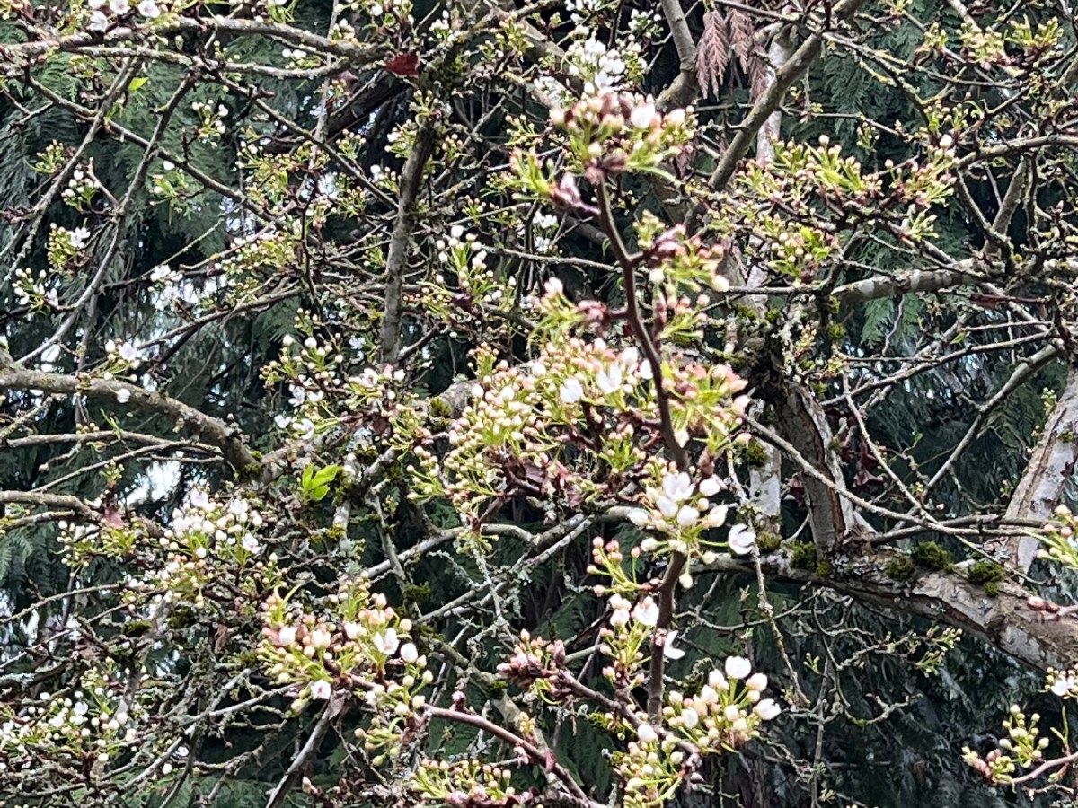 Out in front of the house, our pear tree is blooming, too.