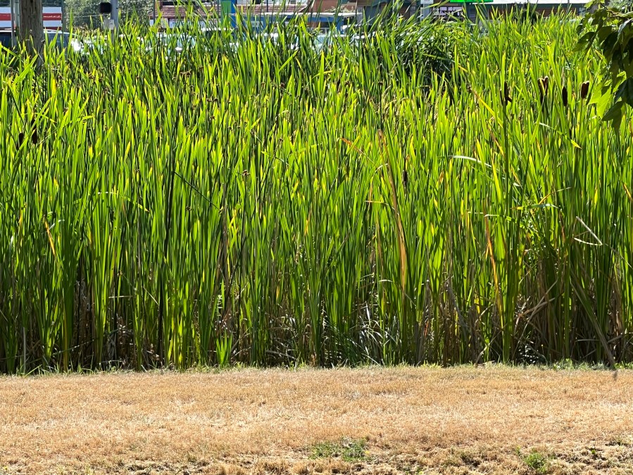 My first photo this week was just taken yesterday afternoon.  I needed some cash, so I dropped by my credit union to use their indoor ATM.  As I was walking back to my car, which I had parked in the shade on the perimeter of the parking lot, I noticed the holding-pond on the corner of the street outside.  It was planted with cattails, and looked just so summery!