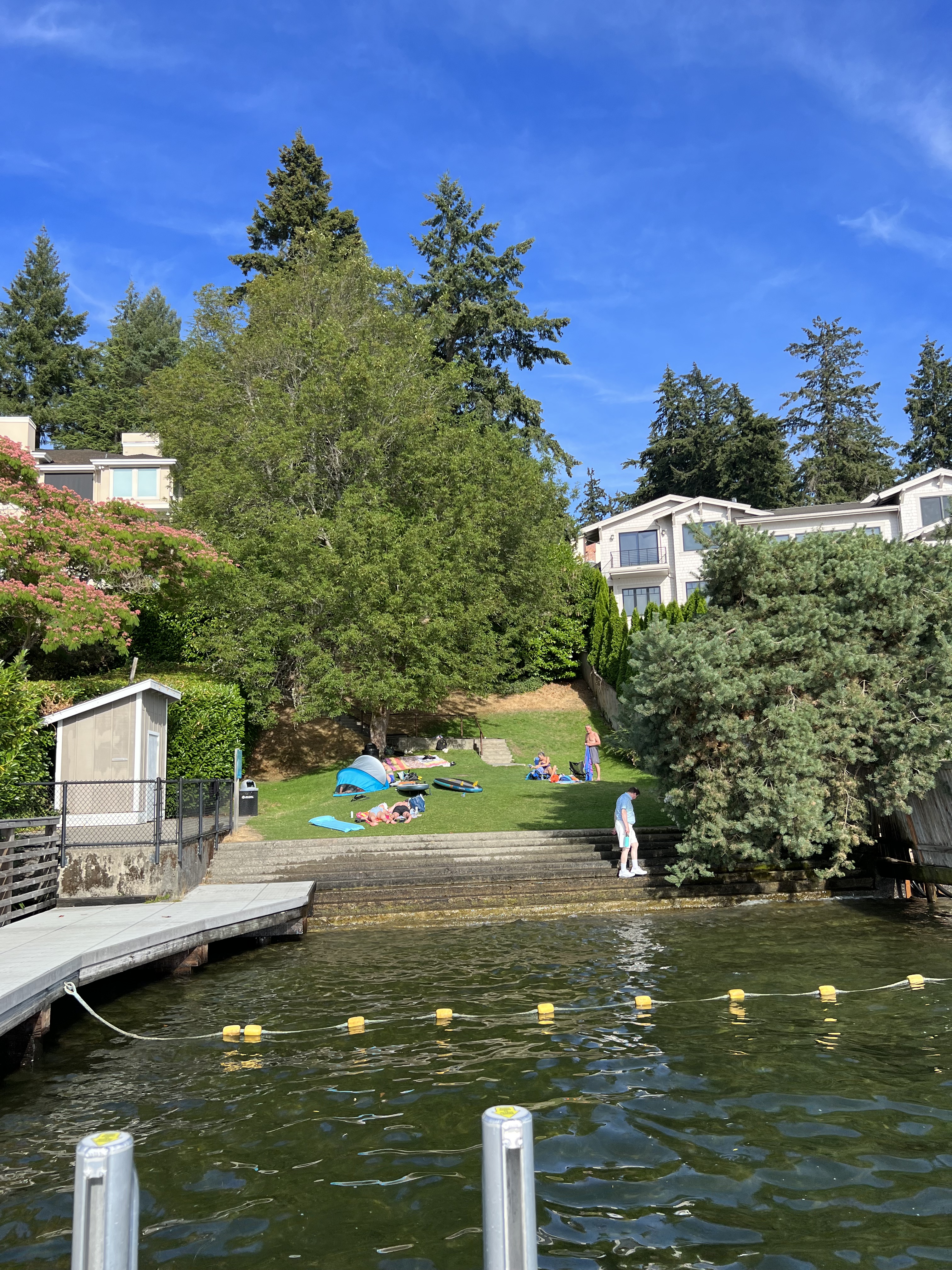 Notice how little snow there is on Mount Rainier.  Last year’s big heat-wave melted more snow than in any prior year, so there was less to start with this year.  There were boats everywhere on the lake today.  In our drive, we re-discovered a little pocket park on the eastern lake shore.  It had been a very long time since we had been there.  It’s a narrow park, less than the width of one lot, and there’s a long stairway to get to the beach.  It’s called Chesterfield Beach Park, and the name is bigger than the park!  There’s a little swimming dock, and a roped-off area for swimmers.