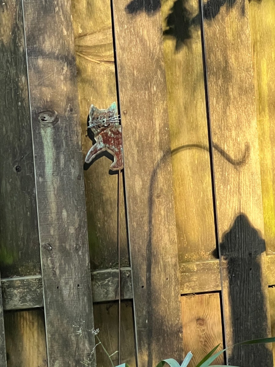 I even found something overlooked in my own backyard. A few years ago, we bought a cute yard sculpture, made out of copper-it’s a cat on a pole. I almost forgot about it, until I was out watering the yard. I didn’t realize where Hubby had put it, but he’s there if you look hard enough.