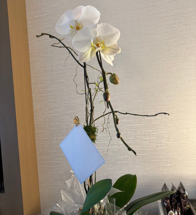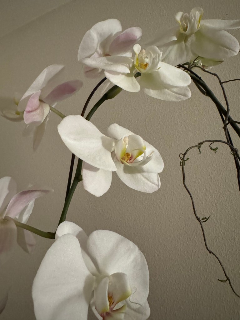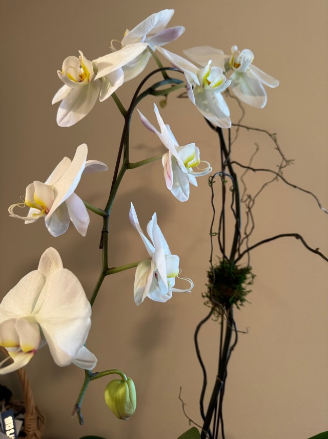 All the individual blooms on my Birthday Orchid are connected by the branches from which they spring. My birthday was in mid-April, and I have taken photos of it from then until now, watching all the individual blossoms open from buds.