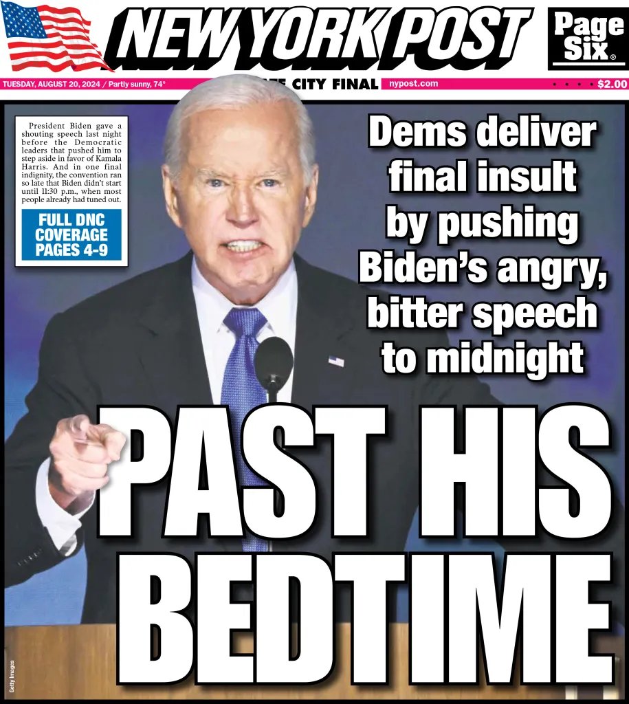 Hmmmmm… Doesn’t look much like a full house, does it? Last night’s big event was the speech by current president Joe Biden, officially saying his farewell to public life. I think everyone was hoping that he would be calm, measured, and appreciative of all his many years in politics. Unfortunately, that was too much to hope for. It seems that the convention organizers, knowing full well that Biden suffers from advancing dementia and can’t operate much after 6:00PM, scheduled his speech for Midnight!!