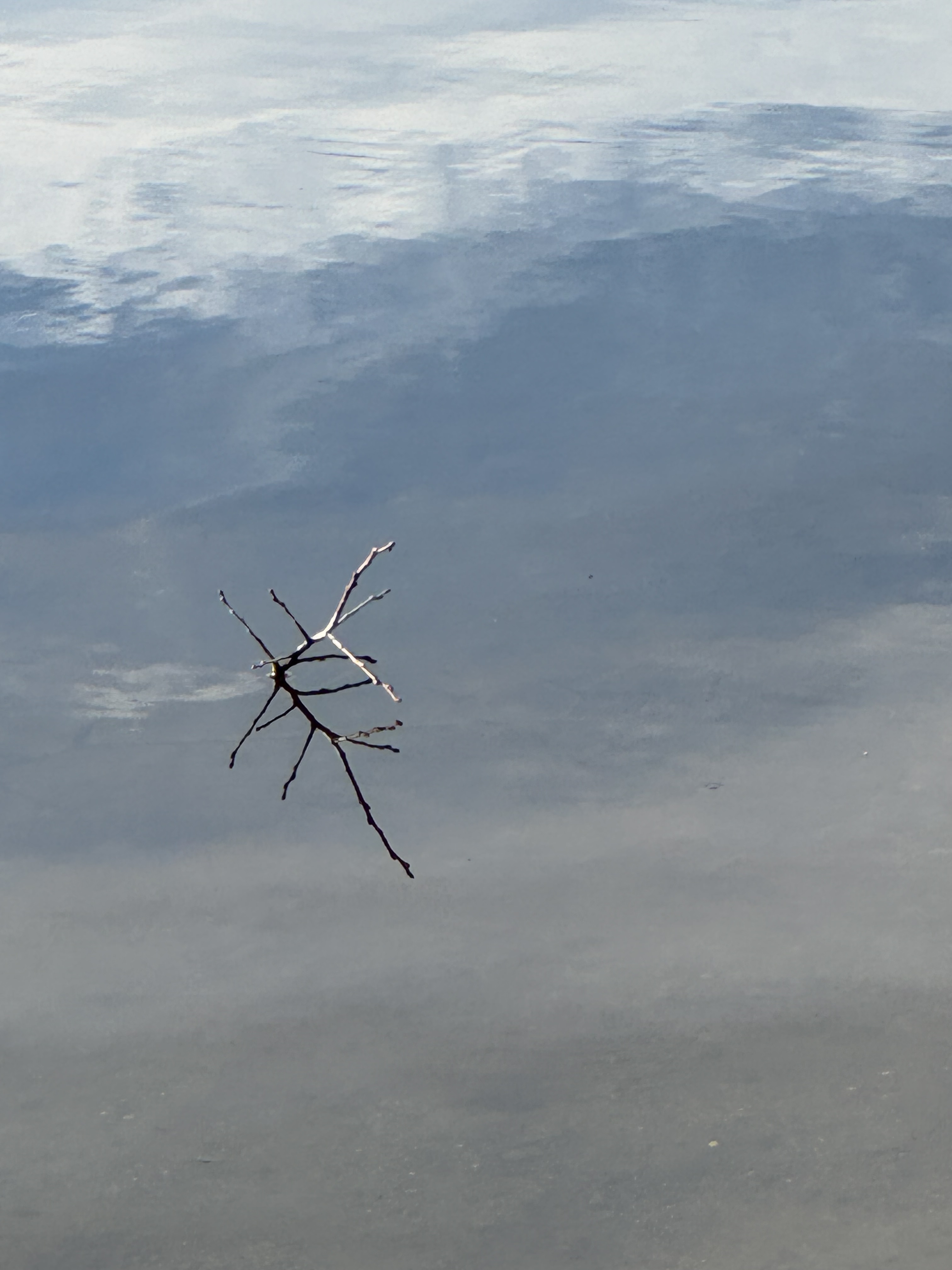 Not too far from shore, just the tip of a submerged tree branch looked pretty lonely, with its reflection as its only companion.