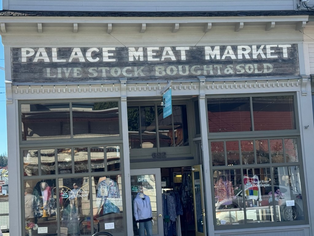 When we had our fill of tulips, we drove into the town of LaConner. We visited the Wheelers’ photography gallery so I could show Hubby, then we walked down the Main Street. We dropped into a shop for coffee and ice cream, then headed back to the car. I was taken with the very old mural on the front of one of the buildings.