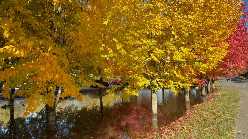 The little body of water is an overflow pond that I had never seen so full. We had a big rainstorm over the weekend, so that pond did its duty well. Mother Nature also left enough leaves on the trees, which I was afraid would all be stripped away by now, so I could capture their splendid colors.