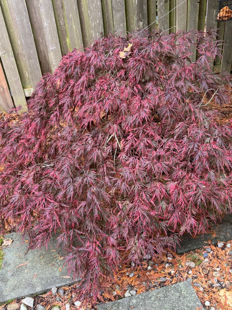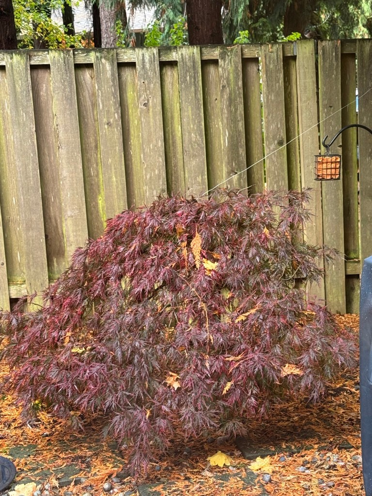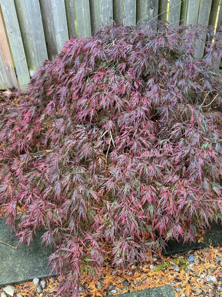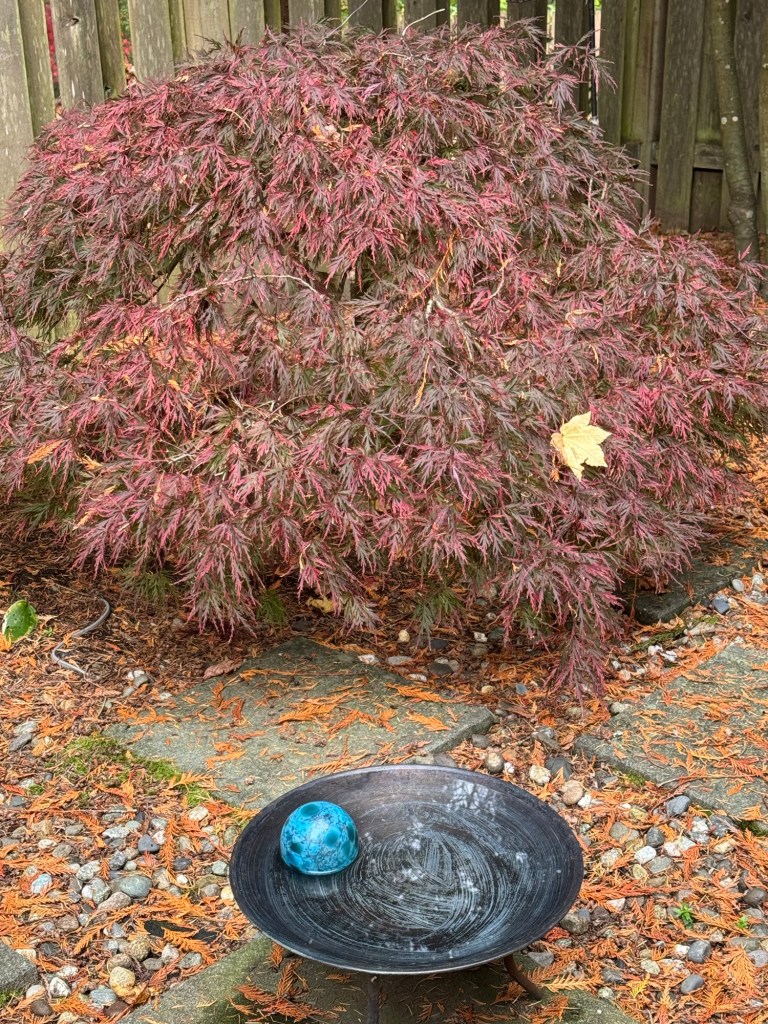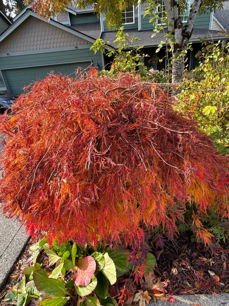 Let’s start with our own backyard. We have three Japanese maple trees, which have three color phases. For most of the year they are a mixture of green and maroon. In the fall, they turn more reddish, and in early November, they turn bright red. For the last couple of weeks, I have been taking photos of all three trees daily to see if I can track the changes.