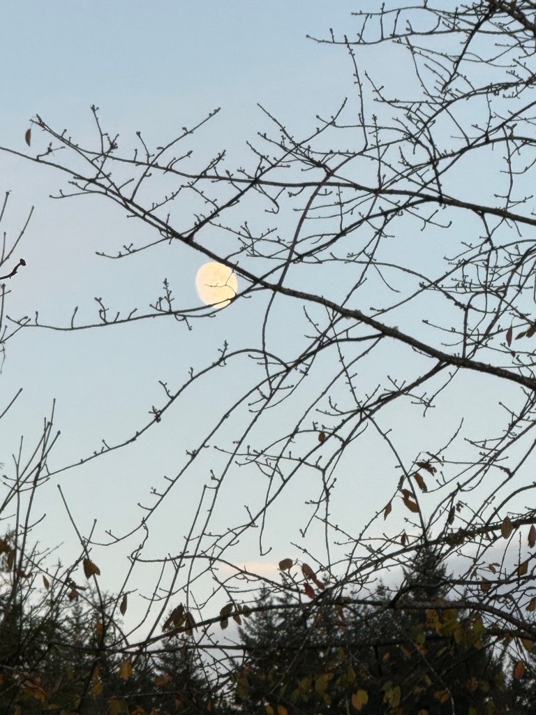 The Moon looked misshapen, before we noticed that it’s not quite full yet. This week will see another Super Moon, and this shot is just missing its lower left sliver.