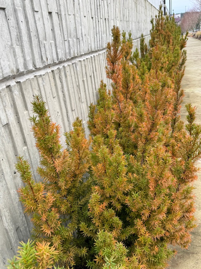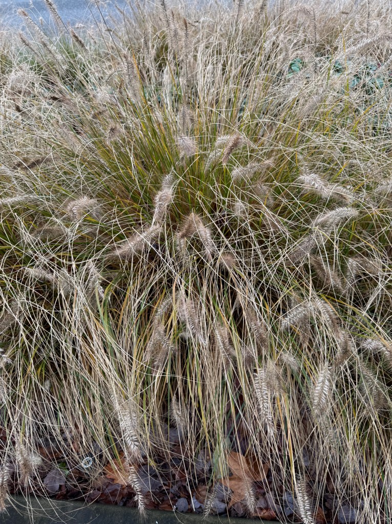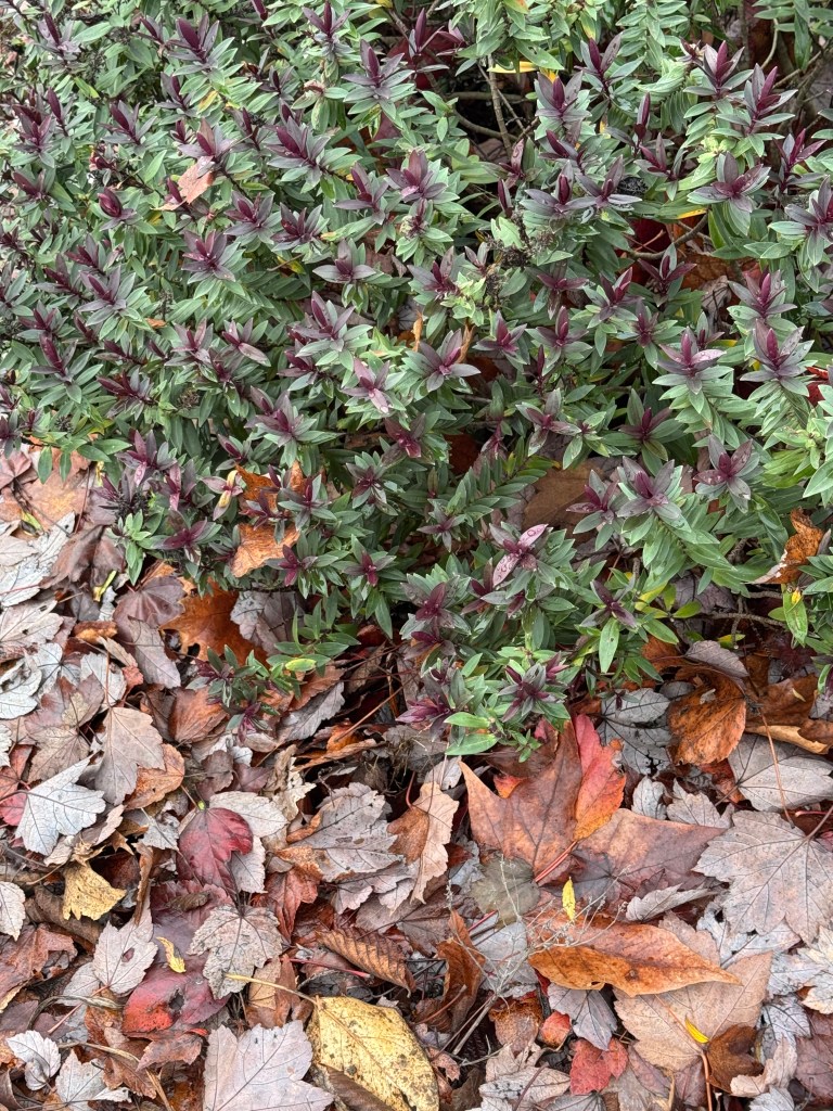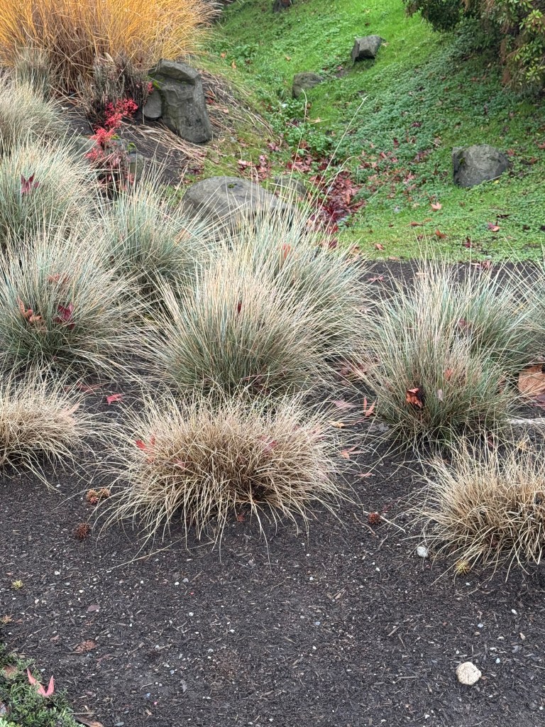 The planting strip alongside the road was also quite colorful, and the businesses or the city planted interesting-looking bushes and ornamental grasses, and used fallen leaves as mulch, making a pleasant contrast in color and texture. Readers are welcome to chime in with the names of the plants!