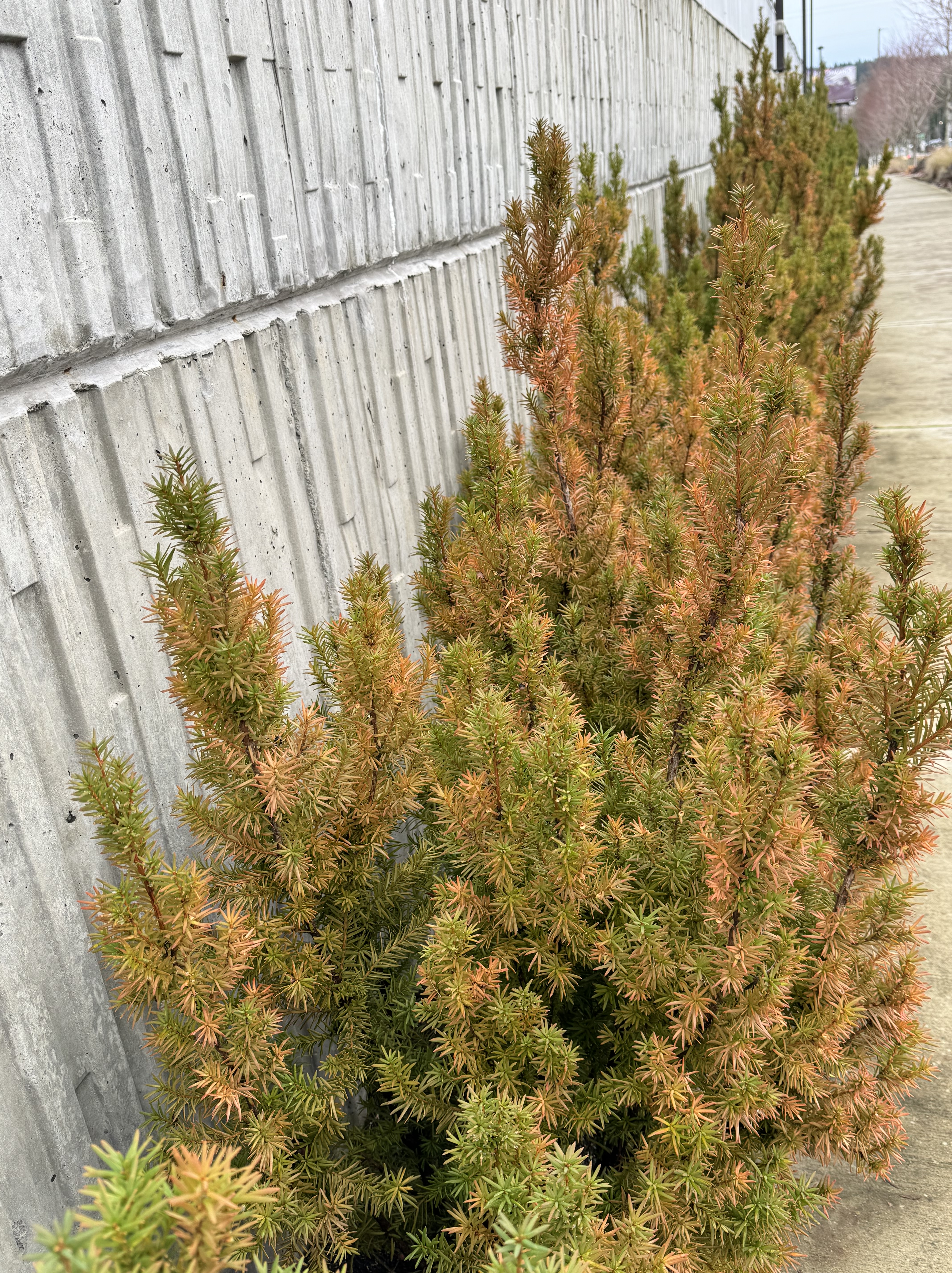 Inboard of the sidewalk was a retaining wall for a business area along the street, and it was planted with little trees. They were colorful. They even went to the trouble of adding some texture to the plain concrete wall.