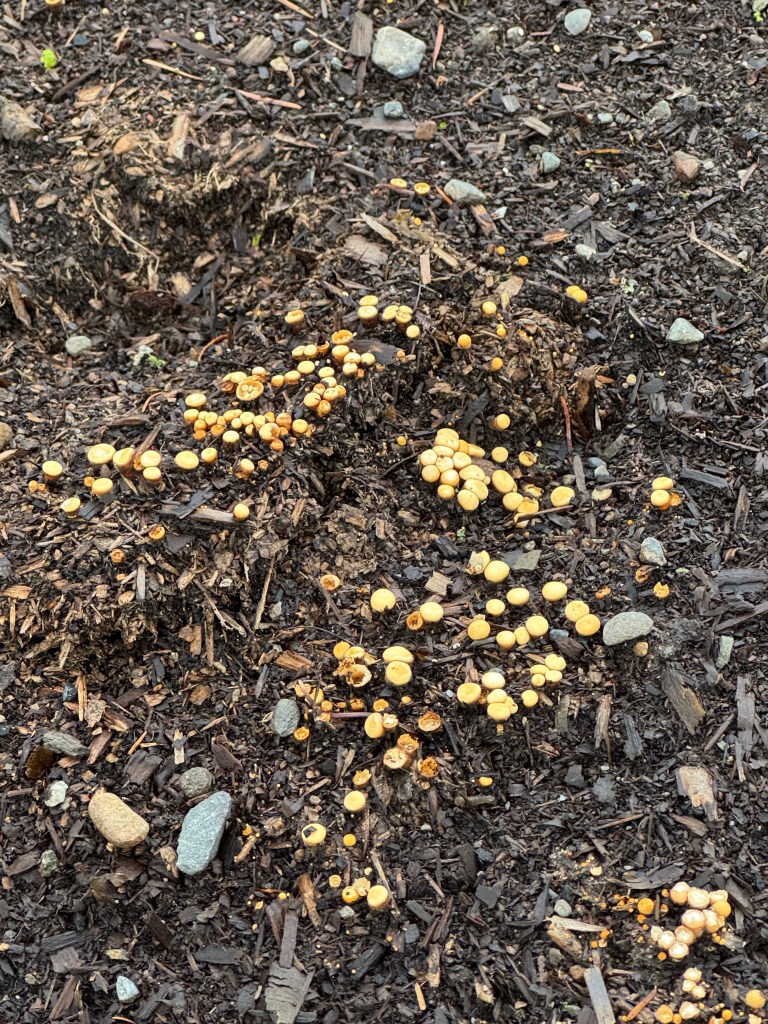In that same little rock garden, I spotted some tiny, brightly-colored fungi. I can’t recall ever seeing this before. Does anyone know what they are?