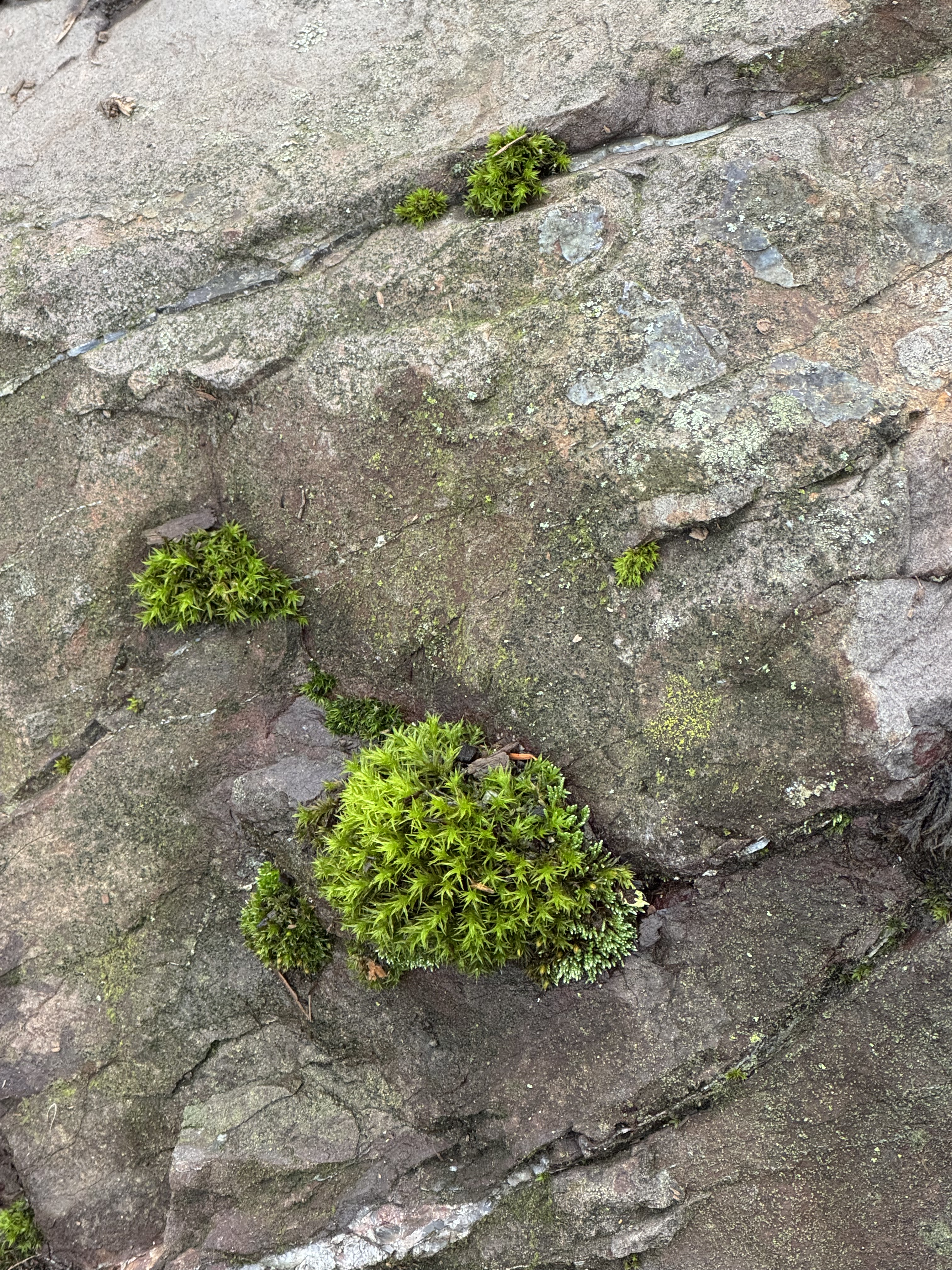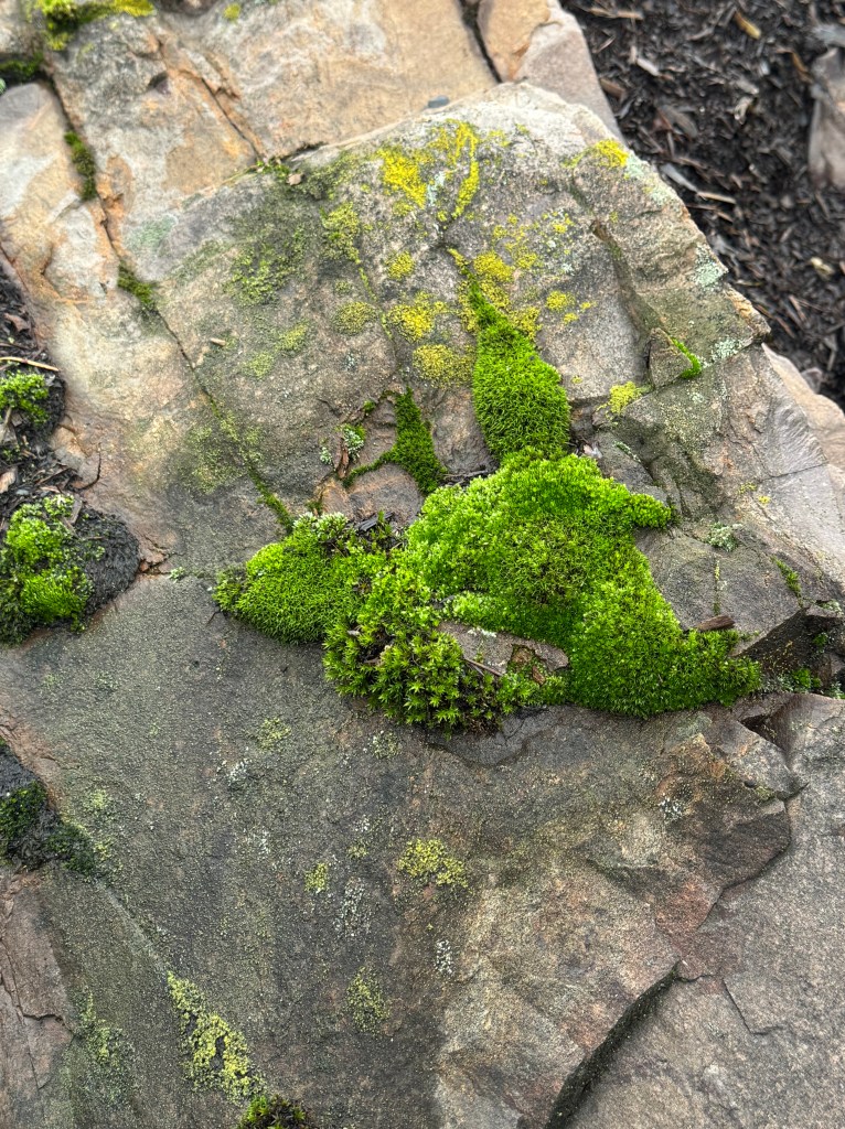 It doesn’t take much to attract mosses and lichens to the surface of big rocks. And I’ll just bet there are tiny organisms among the green mosses.
