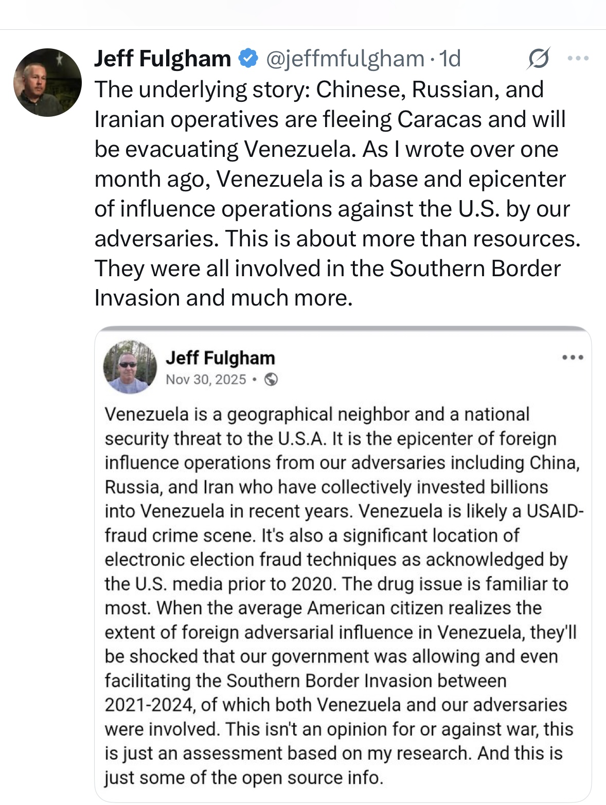 The real reason for the exact timing was to send China a direct message that sent shivers across the global world. You see 3 hrs before we hit, China sent its top brass to meet with Maduro. China has a big investment in Venezuela. They wanted to control their oil and resources.