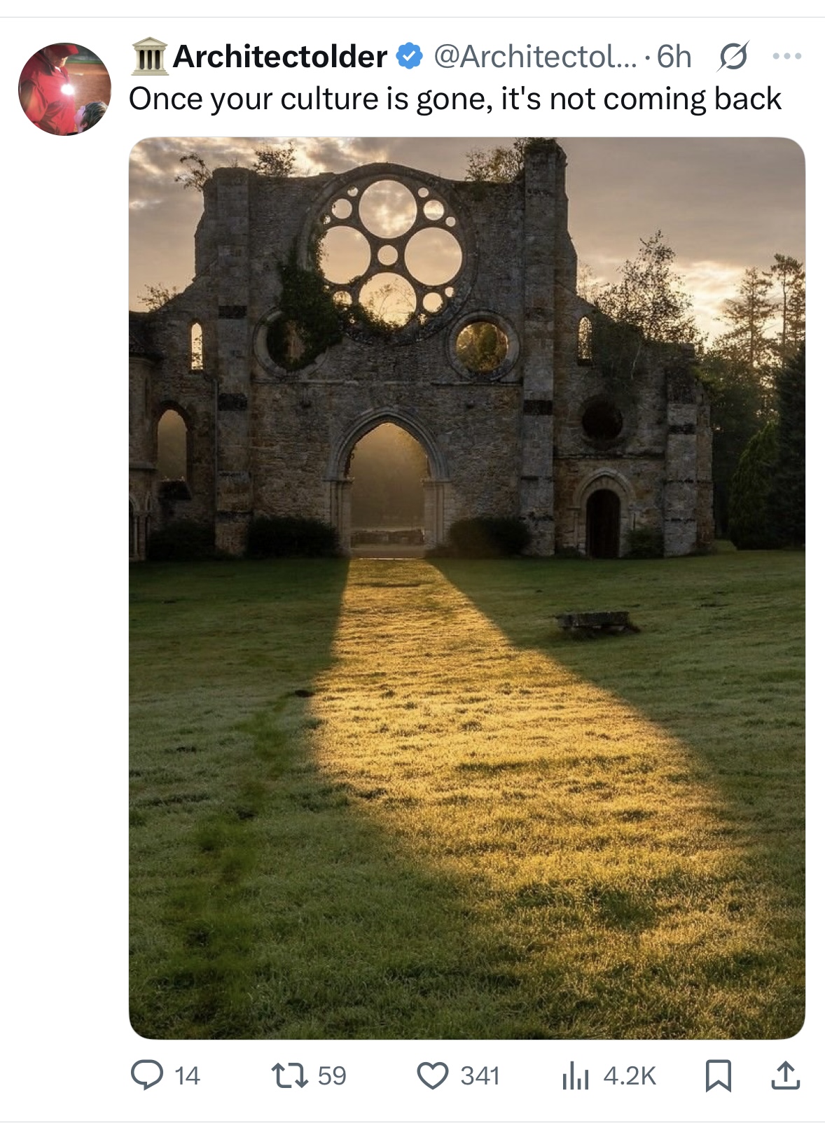 Final comment from my online friend Architectolder. He is correct that once your culture is gone, it will not come back. Well, maybe after a couple of hundred years under brutal tyranny. But wouldn’t you want to preserve this instead?