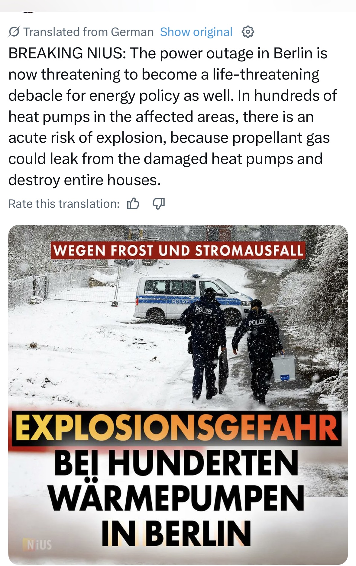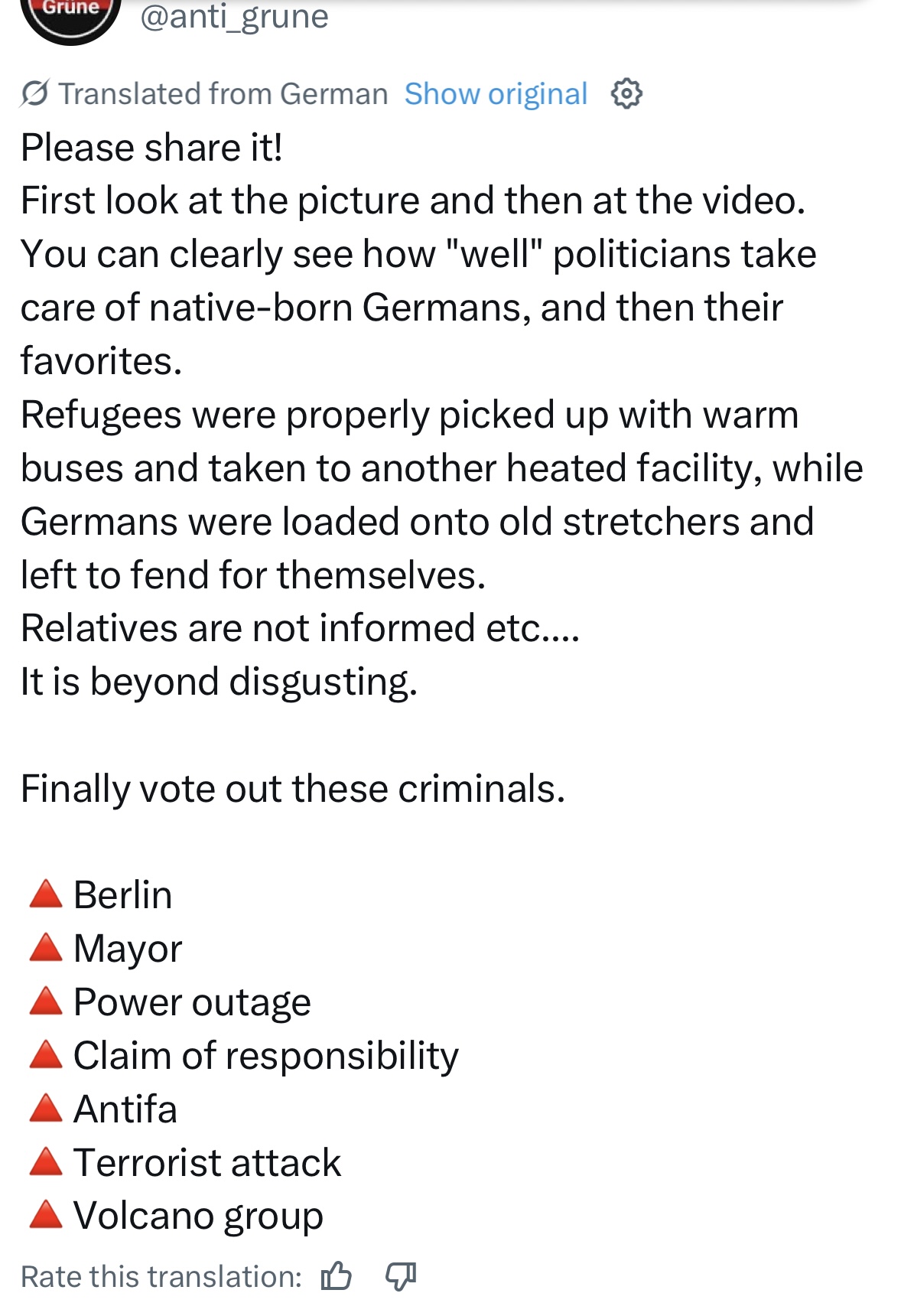 Note that German citizens are last, after the “migrants” are taken care of by the German government in the blackout situation. This kind of behavior is becoming very common in many European countries. One commenter also notes that they are sending available generators to Ukraine, while Germans freeze in the dark. That sure sounds like civilizational suicide to me.