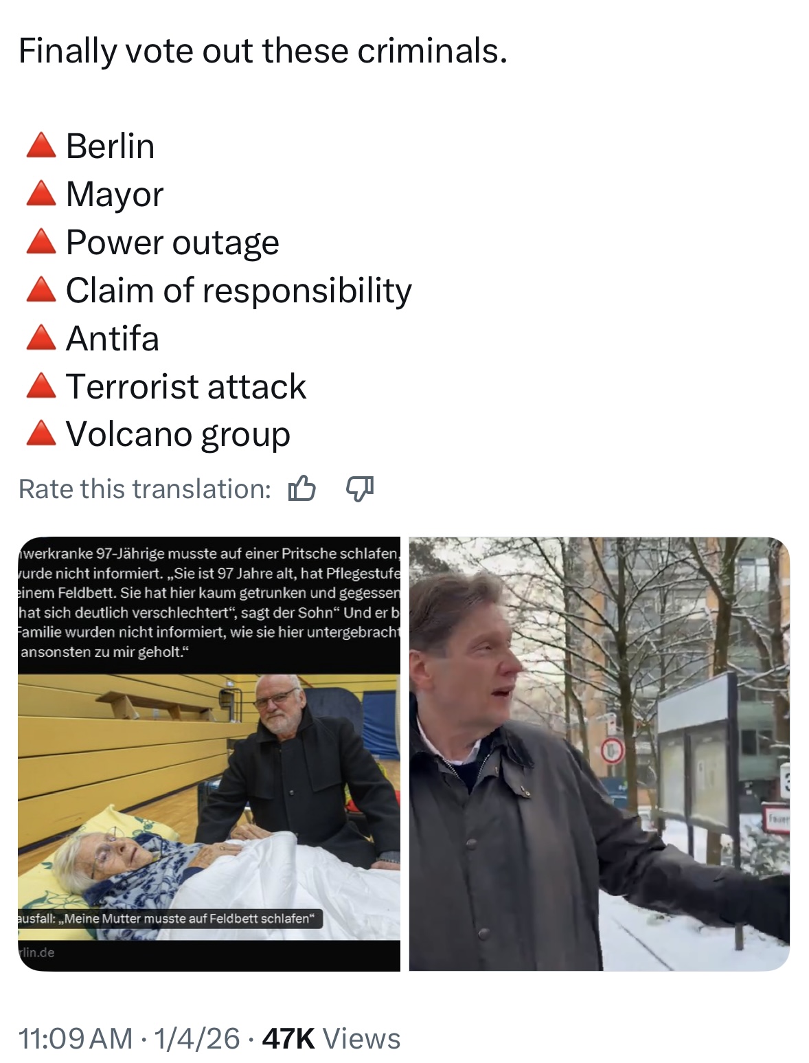 Now, the Lights are really going off in Europe. Just this past weekend, there was a massive power outage in Berlin, caused by sabotage of the electric grid by an Antifa branch. These terrorists have been operating in Europe for years, and they are now more out in the open. First, from inside Germany.