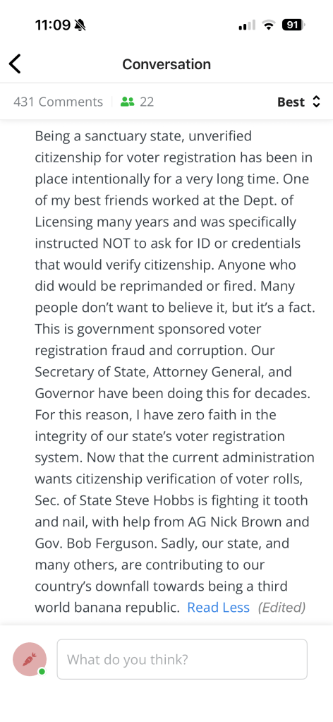 As an example of how some citizens view their government, below is a comment from a KOMO story this week.