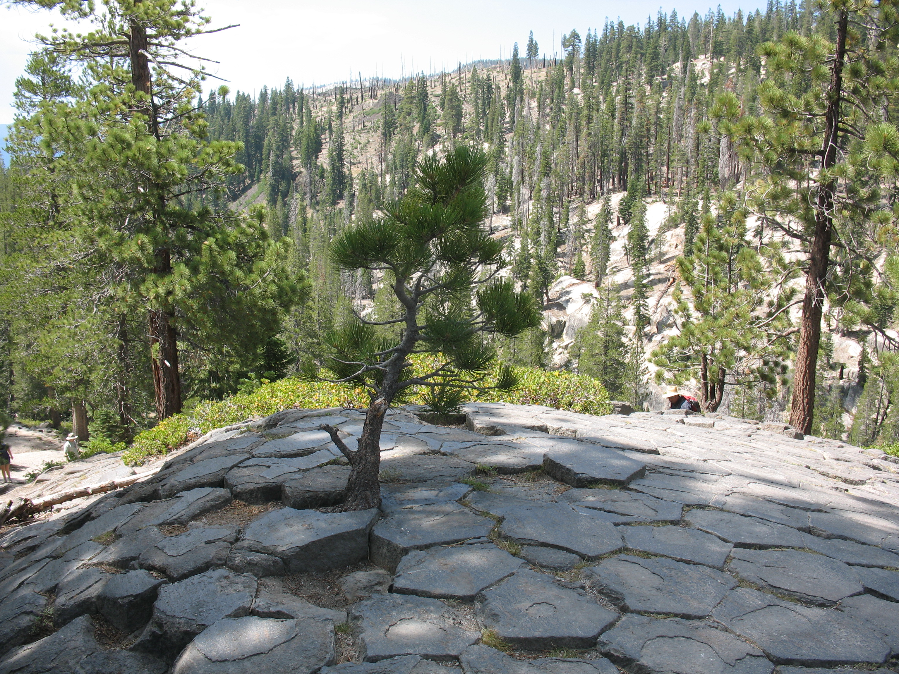 This is Devil’s Postpile in California, and you can easily see the six-sided structure of the columns. Quite remarkable! As the rock is broken down by freezing and thawing, it makes little bits of soil, which are colonized by seeds of the pine trees you can see growing out of the rock. This is how big mountains become beaches!