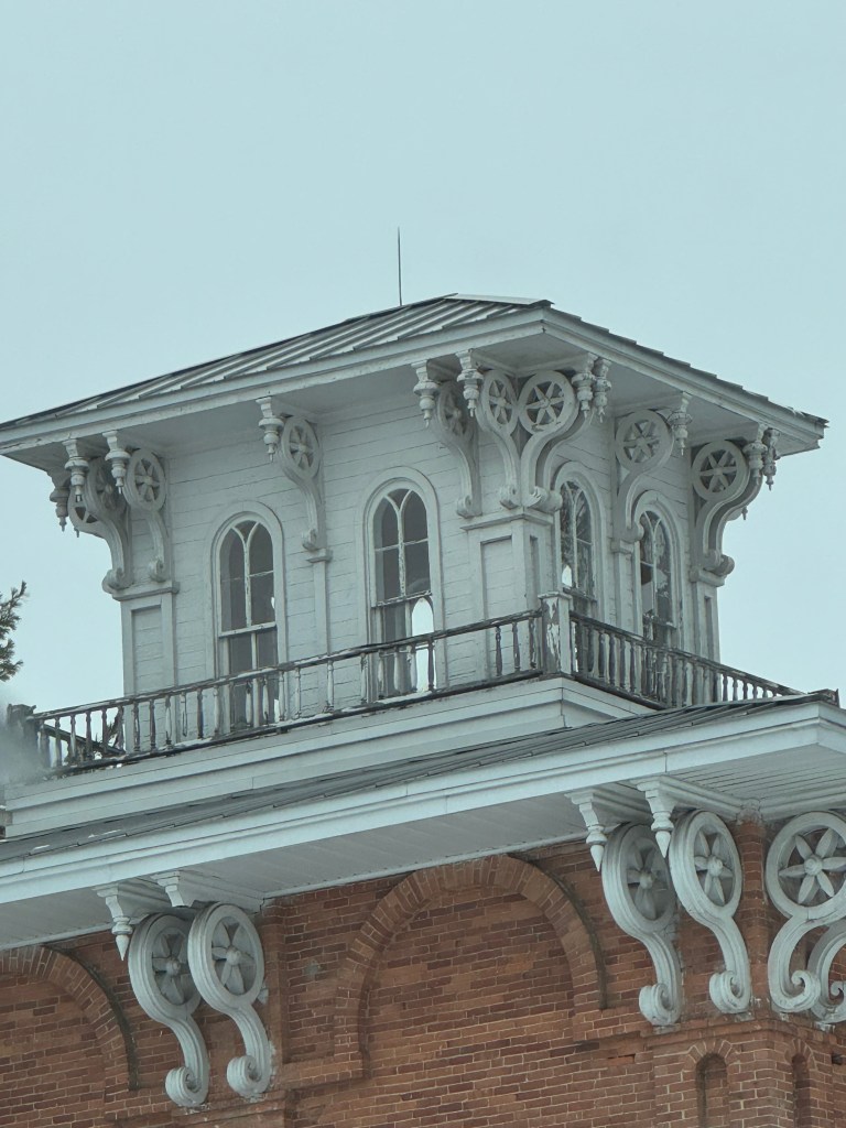 That is a fine, old building, in fairly decent shape, probably dating to the mid-19th Century. It’s built in a Classical style-like the columns on the wooden enclosed porch on the first level.