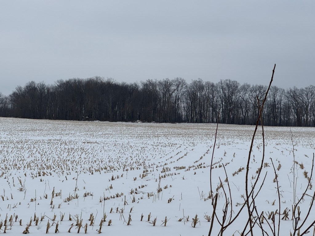 Snow-covered field with wheat stubble. When the snow melts, the field gets watered by Mother Nature.