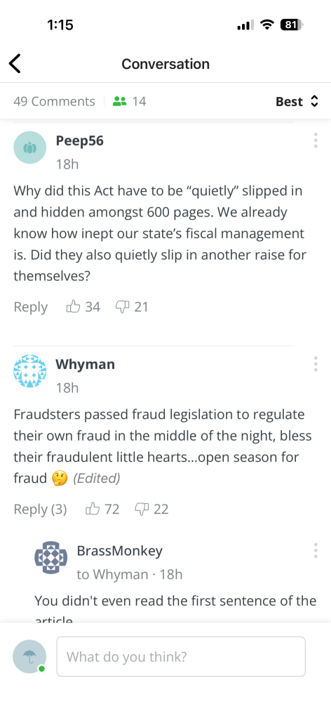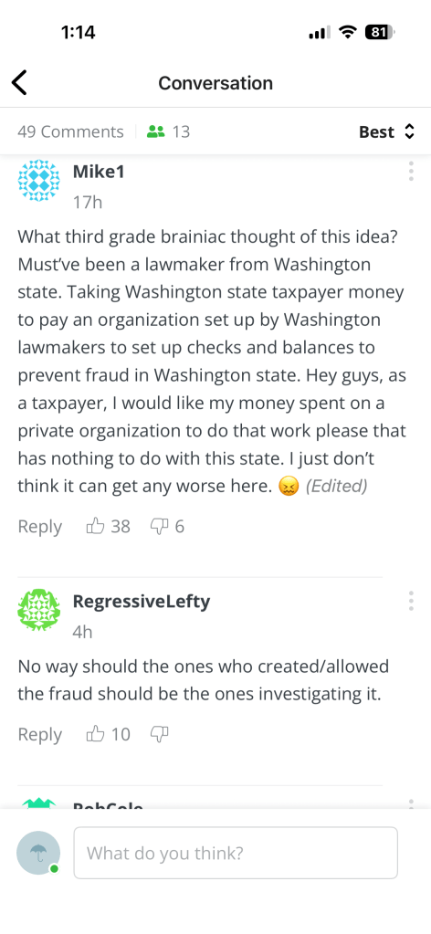 This is only one incident, more investigations have been held. So today, we see an article in KOMO News that the state legislature “quietly” included in their over-spending budget bill, money for “internal audits” of government agencies to root out “waste, fraud, and abuse”. This is the same legislature that refused to fund or support the State Auditor’s Office hiring an impartial third party to audit state agencies. So, now, we have the classic “fox guarding the henhouse” situation where the profligate-spending legislature vows to audit ITSELF to find the waste that they engage in every day! Below are a couple of pages from the comments on the KOMO article.