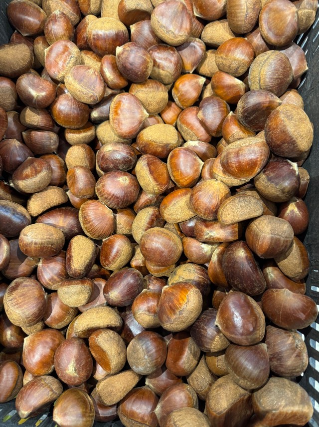 One of the huge benefits of having a camera with you always is the ability to find the beauty in mundane, everyday objects. These are chestnuts for sale at our Asian grocery store. If you zoom in on them, you see how the shape and texture is different on every individual nut. This store goes to a lot of trouble to make their displays pleasing to the eye, and every time we go there, I am on the lookout for good photos. They never disappoint.